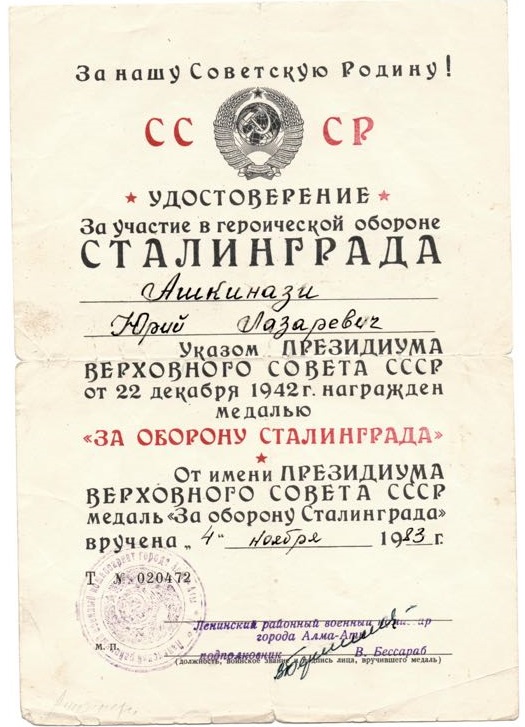 בשל השתתפותו של יהודה אשכנזי בקרב אמיץ בהגנה על סטלינגרד, ב- 22 בדצמבר 1942, החליטה המועצה העליונה של ברית המועצות להעניק לו את מדליית "הגנה על סטלינגרד". המדליה הוענקה לו ב-4 בנובמבר 1983.
